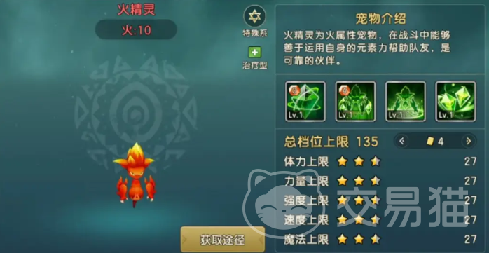 火精灵是可以在宠物使者那里使用金卡兑换的,虽然价格有点高,但是只需要用金币慢慢的累计金卡就可以进行兑换了。
