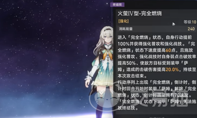 除了这些基础的角色技能之外,游戏里角色比较厉害的就是终结技,这个技能使用之后能让角色速度提升60点,在这个基础上还可以增加比较优秀的输出能力,在回合对战的时候能利用这个技能产生三次或者四次的高额伤害,在这种设定下,角色就非常适合作为队伍的主力辅助进行对抗。
