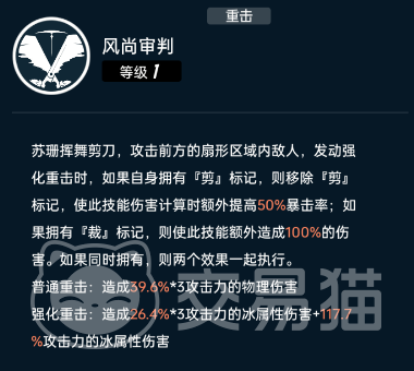 苏珊的重击技能“风尚审判”是一个扇形区域的强化重击。当苏珊拥有“剪”或“裁”标记时,该技能将触发额外的伤害加成或暴击率提升效果。这个技能的灵活性十分的高,需要大家数量的去掌握使用,可以根据苏珊的状态选择释放时机,对敌人造成致命打击。而苏珊的特技技能“缪斯闪袭”是一个位移加攻击的技能。她向前冲刺并发动攻击,若命中将为自己施加“剪”标记。若已拥有“剪”标记,则发动ex特技,最后一击命中时还将回复部分能量值。这一技能不仅能够帮助苏珊快速接近敌人或逃离危险区域,还能够在关键时刻为她提供额外的能量支持。