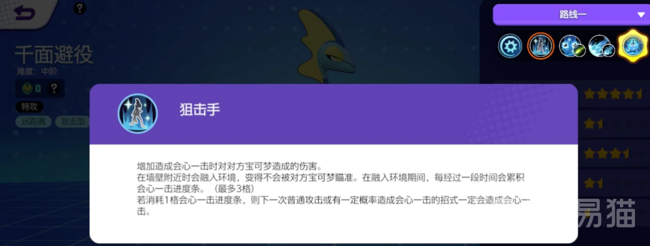 这个宝可梦挺有意思的,大家普通攻击三次之后,它就会变得更厉害,进入强化普攻状态。这时候它打出暴击的机会和伤害都会变高,而且,它还有个被动技能,就是狙击手,如果我们靠近墙壁,它就会隐身,让对方找不到我们。在隐身的时候,它会慢慢攒暴击能量,这个能量有三格,这个宝可梦越打越厉害,还能隐身攒暴击,真的挺强的。
