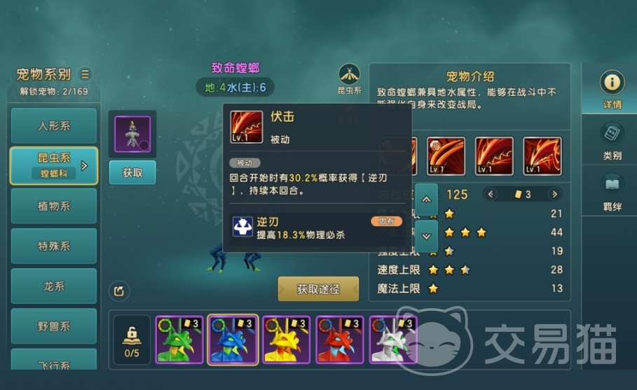 致命螳螂的被动为伏击,它有概率让致命螳螂在回合开始时进入逆刃效果,能提高致命螳螂打出物理必杀的概率。若是玩家觉醒了致命螳螂另一被动技能利刃,那么在逆刃时致命螳螂的攻击会无视目标一定的比例的物理防御,是一个能让致命螳螂获得一定物穿效果的被动。