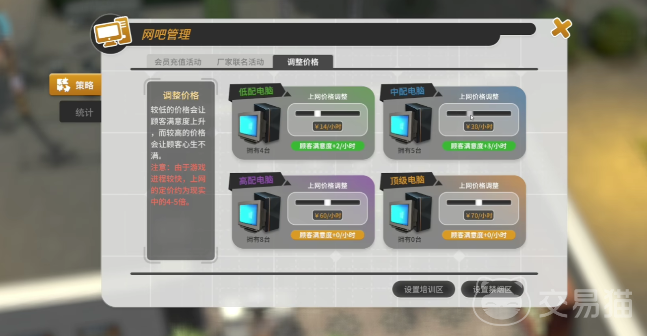 在网吧进化论这款游戏中,网吧电脑的配置、网吧内的氛围、网吧的装修都是决定网吧整体营业额的重要元素,小伙伴们可以通过升级设备来增加留客率,也可以通过加大运营来增加营业额,比如说将上网时间和赠送的饮品相联系促成优惠活动,又或者是增加服务人员的服务水平,来让前往网吧上网的客人感觉到归属感。