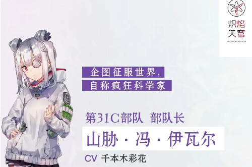 山胁·冯·伊瓦尔所属部队是31C,身高:156cm,生日:8月25日,出生地:熊本,CV:千本木彩花,她野心很大,试图征服世界,自称疯狂科学家。这里值得提一下的是山胁·冯·伊瓦尔的技能,如果放弃一轮防御力,就有机会给我们一名成员多一次放大的机会,而且山胁·冯·伊瓦尔的群体攻击大招可以对全体无偏4hit攻击,被动技能位于前排时也能使全队的攻击力增加百分之十。