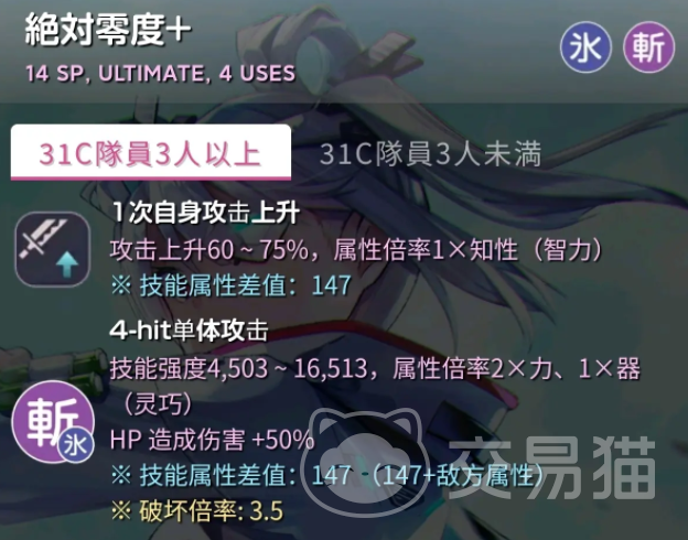 同期的山胁也增加了三名以上31C队员的配队需求,一样达到HP+50%,加上不需要李映夏的优势与雷山胁自带的连击珠,都让山胁未来可期。31C队员3人以上,1次自身攻击上升攻击上升60~75%,属性倍率1x知性(智力),技能属性差值:147(+敌方属性),4-hit单体攻击技能强度4,503~16,513,属性倍率2x力、1x器(灵巧)HP 造成伤害 +50%,技能属性差值:147(147+敌方属性,破坏倍率: 3.5。