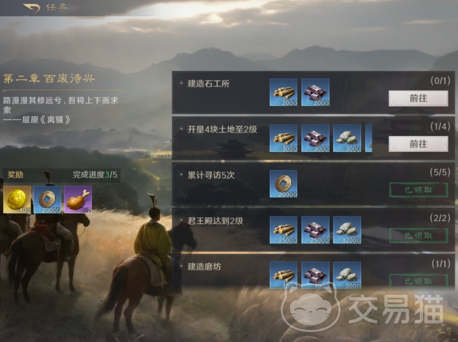 开局后玩家们可按任务章节的指引,来完成建筑的升级和熟悉游戏的一些玩法,并以尽快完成任务拿到奖励为第一优先目标,将资源全部投入到与任务有关的项目上,好令自己更快地解锁更多的游戏内容,不至于在某项玩法落后于他人。