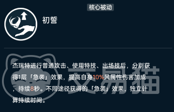 在风队中,杰瑞特无疑是最核心的角色。他是一位顶级角色,以其强大的风属性伤害和独特的技能效果,成为了风队不可或缺的主力。杰瑞特的特点在于他的被动效果,无论是在使用普攻还是技能时,都能获得相应的增幅效果,这种效果能显著提高他的风属性伤害,持续时间为8秒。通过不同途径获取的急袭效果,其持续时间独立计算,因此可以叠加起来并长时间保持加成,使得杰瑞特在伤害方面表现出色。