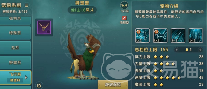 狮鹫兽,这个名字听起来就充满了神秘与力量。它不仅仅是一只宠物,更是游戏中的一名飞行系战士。想象一下,在游戏里有一对巨大的翅膀,让它能够轻松翱翔于天际,给敌人带来出其不意的打击。狮鹫兽的速度非常快,高达48点,这在游戏中可是非常难得的优势,一般的宠物并没有这么高的速度,这意味着它能够在战斗中先发制人,抢占先机,随时秒贴脸敌人身边。