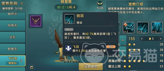 此外,狮鹫兽还有一个叫做“锐羽”的被动技能。这个技能在狮鹫兽造成伤害时有一定概率触发,触发后可以叠加一层飞羽效果。这个技能与“飞羽盾”配合使用,可以让狮鹫兽在战斗中更加游刃有余。狮鹫兽是一只非常强大的宠物。它既有出色的输出能力,又有一定的防御能力,可以在战斗中扮演多种角色。而且它的速度优势也让它在战斗中更具灵活性。如果你在游戏中获得了这只宠物,那么不妨好好培养它,相信它一定会成为你战斗中的得力助手。