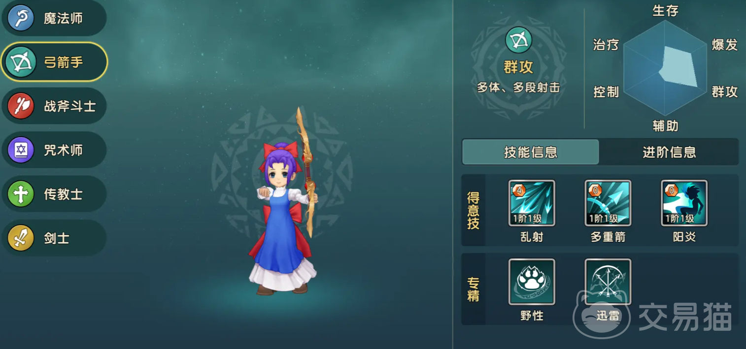 我们在游戏里面完成试炼任务之后,便可以进行就职,游戏目前共有着六个职业。简单划分的话可以分为物理输出,魔法输出和辅助。首先是物理输出,弓箭手,战斧,剑士这三个职业都是属于这个系列,首先是弓箭手,他是目前玩家们选择最多的物理职业。此职业的在首次开荒的时候有着非常高的优势,他的清怪速度是几个物理职业之中最快的,同时他养成的难度不高,基本上专精乱射这一个技能就行。所以才会收到玩家们的喜爱。