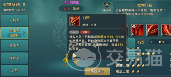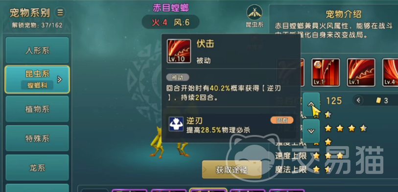 说到黄螳螂的技能,那真的是让人眼前一亮。它的一技能能够造成高额的物理伤害,并且当自身物理攻击高于对手时,还能额外发动一次攻击,给对方造成不小的压力。而二技能则是一个强大的群攻技能,可以连续三次攻击对手,造成可观的伤害。如果对手的血量已经降低了一定程度,黄螳螂还能额外提升自己的伤害输出,让对手更加难以抵挡。黄螳螂还有一个非常实用的三技能,它能够在回合开始时有一定概率获得暴击效果,给对方造成额外的伤害,并且这种暴击效果还能持续两个回合,让对手陷入更加被动的局面。