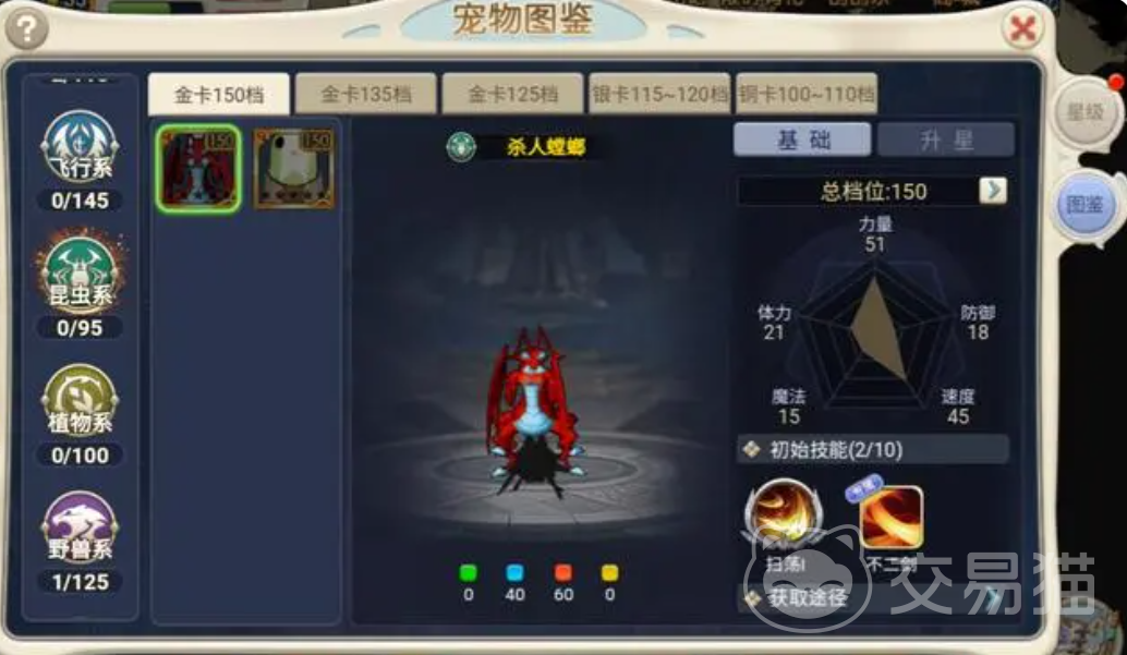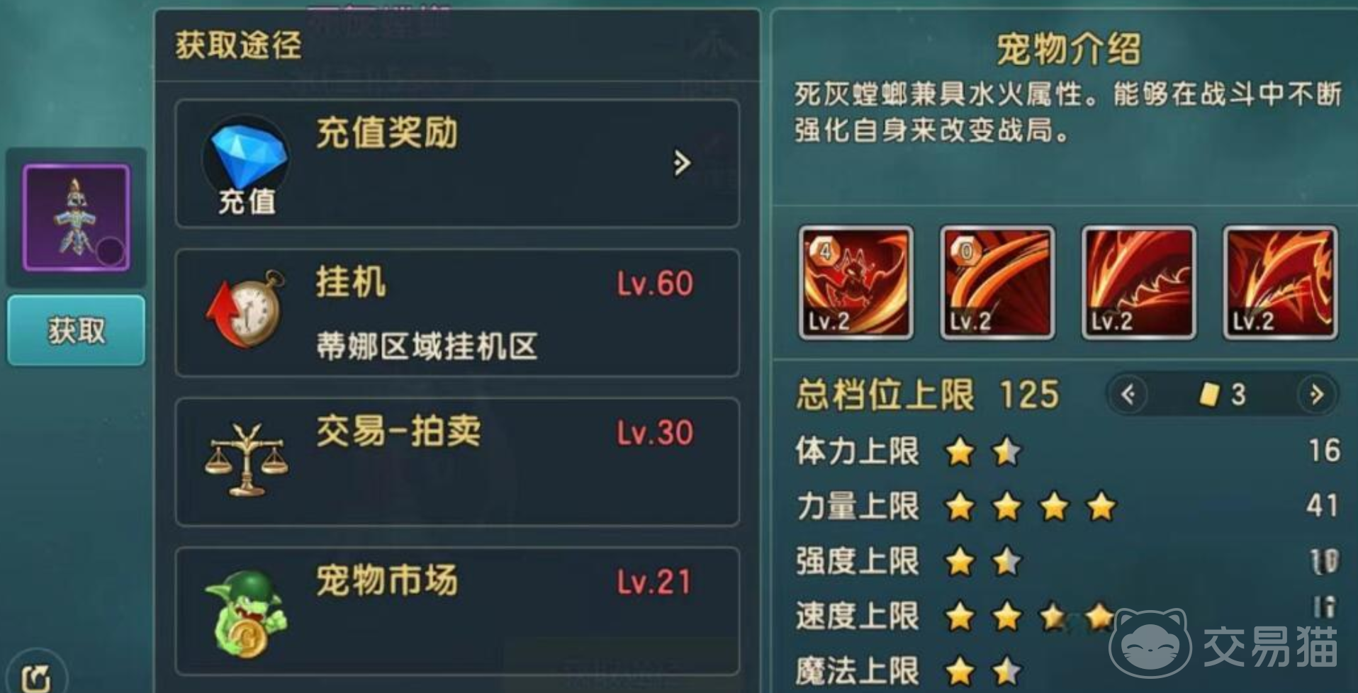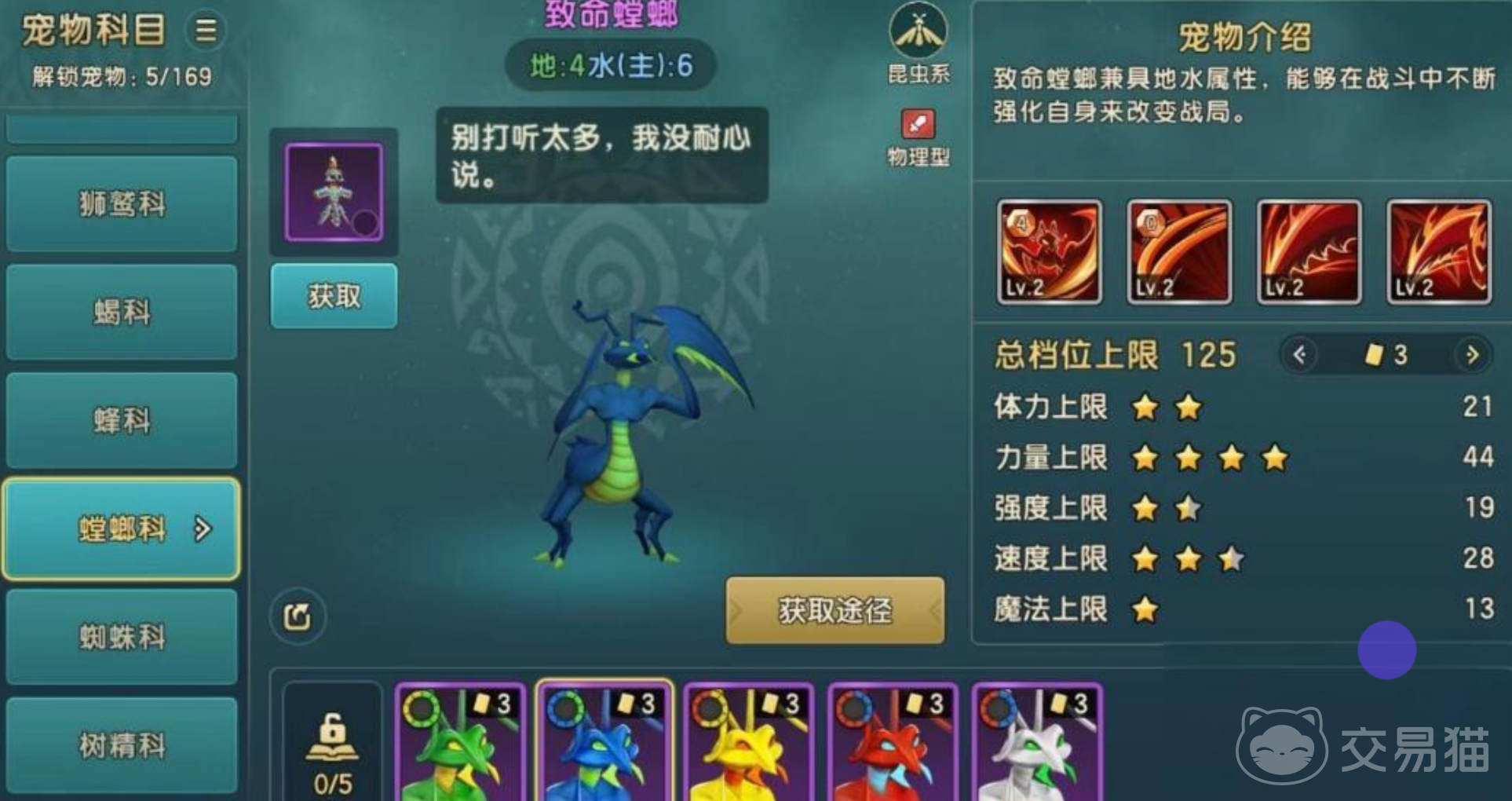要说杀人螳螂,它是比较好用的,作为宠物中的一种,它拥有无限的力量,因为它的速度成长是三颗星。由于它的造型相对的酷炫,并且在选择颜色方面丝毫不吝啬,简单来说就是杀人螳螂能够有多种颜色可供玩家选择,不过玩家在选择具体颜色的时候也需要注意不同的颜色,在属性方面存在一定的差异性,比如有些杀人螳螂的成长,体力会高一点点。