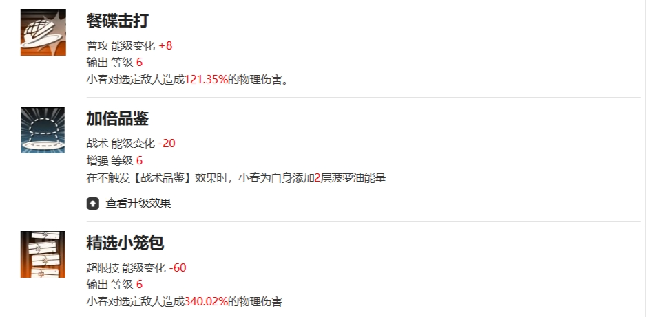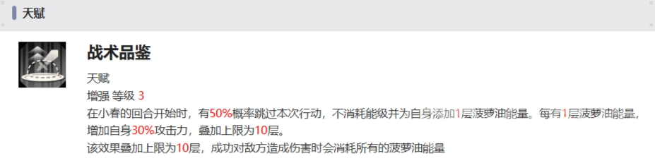 小春在新月同行当中是一个攻击和输出的角色,主要的职责是在战斗中造成伤害,但是没有辅助队友的能力,它一共是有三个主动技能,它的工具是使用餐碟来来进行攻击,它的天赋“战术品鉴”在小春的回合开始时有50%的概率会跳过本次行动,需要注意的是小春的攻击加成效果是叠加的,它的支援技能而可以对敌人造成340.02%的物理伤害。