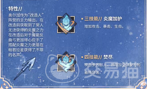炎魔加护:属于一个被动技能,在使用之后可以增加35%的攻击,25%的暴击,还有20%的生命。在战斗开始时还能有效增加友方全体成员10%的减免可以直接维持到战斗结束。