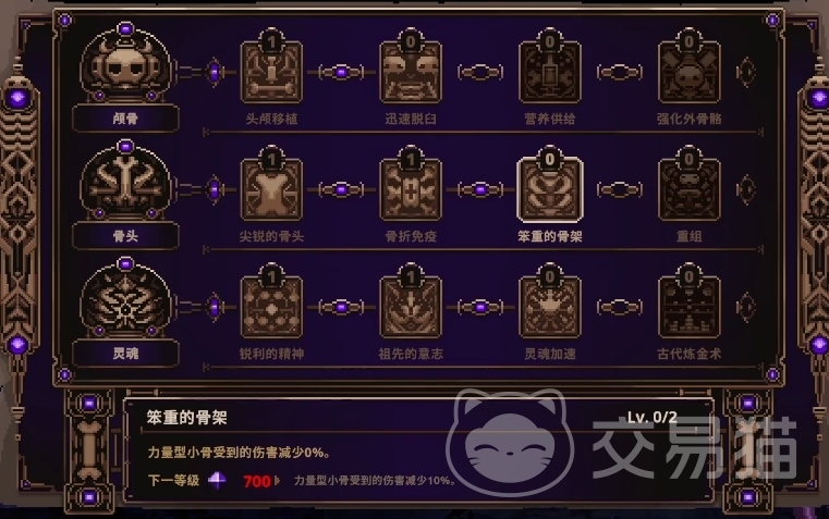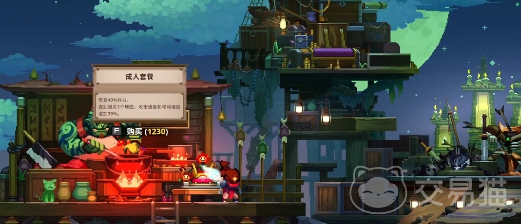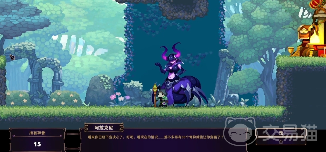 下一个场景不是第三关,而是一个类似商店的过场场景,里面有回血物品,装备,头骨和精华售卖,只需找到对应NPC,然后花费一定的金币即可将需要的东西收入囊中。