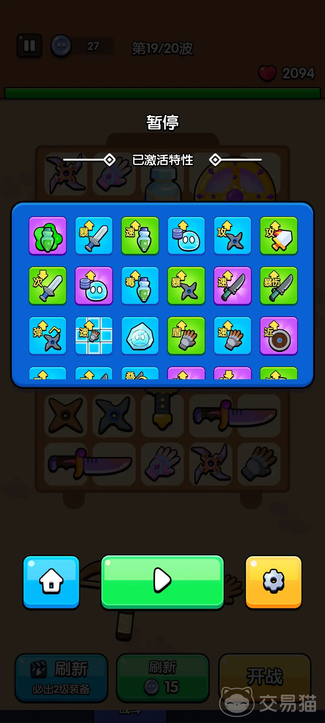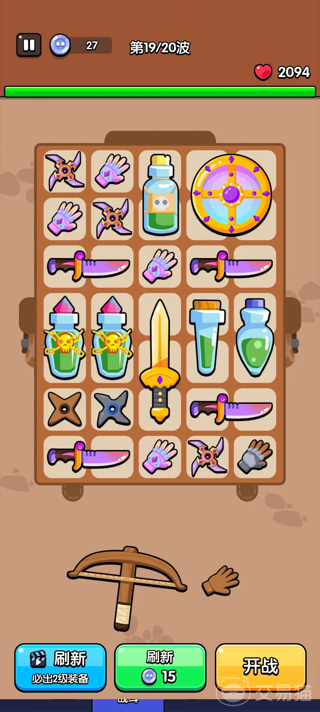 游戏当中在每一关的挑战当中,敌人都是分为不同波次的,需要使用武器将每一波的敌人都击杀,将所有波次的敌人都解决之后才能够进入到下一关当中。游戏开始之前,是可以先行将商店当中刷新到的装备放置在背包里面的,通过刷新商店的方式可以获得更多实用的装备,相同的装备之间是可以放在一起进行合成的,如此就得到升级。钱袋是在每一波次敌人之后,会有额外的银币产出。将基础的工作都做好之后,就可以开战进行游戏了。