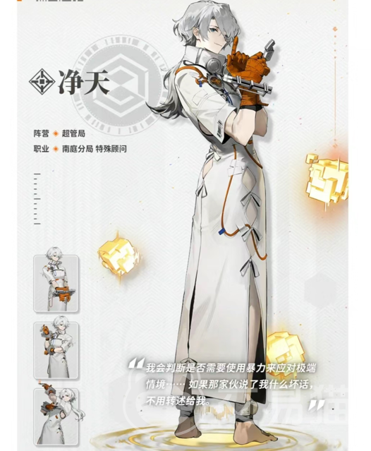 这款游戏中的角色还是非常多的,每个角色都有不同的人物背景,和他独特的人格魅力。其中的净天他就是一个看起来很有深度的角色。他的职务是分局中的一个顾问,是被收编的一个有异常的人形实体。它的星级高达六颗,在游戏中属于输出型,他有着非常强大的输出和生存能力。他的战斗方式是绑定者攻击,作战表现可谓是非常出色的。形象也可以说是非常出众的,一身白色的装束,这个人设非常神秘强大,所以也吸引了很多玩家。
