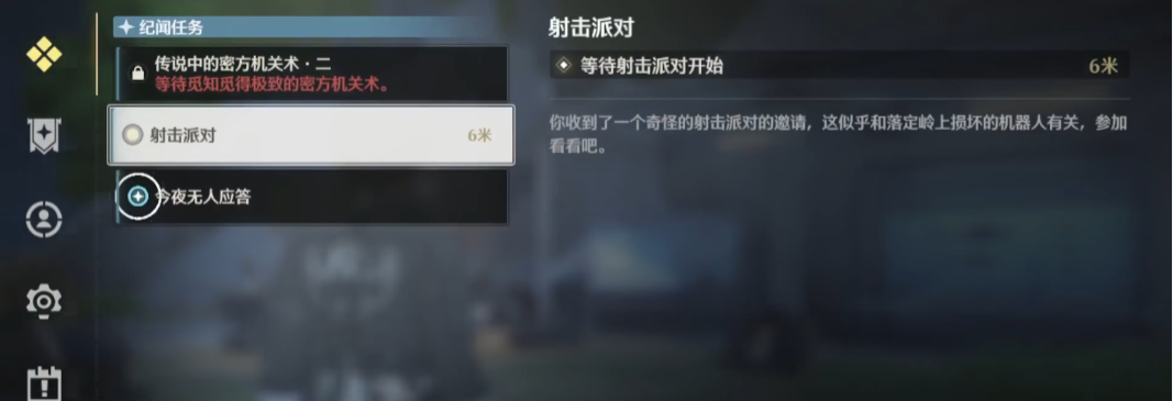首先要将“修理机器人”任务当中的前三个都完成,第一个是“找到备用零件”,第二个是“找到电池”,第三个是“找到发动机”,三个都完成之后,才能够接触到射击派对的任务,这时候就会受到一个奇怪的射击派对的邀请,然后就正式开启任务了。