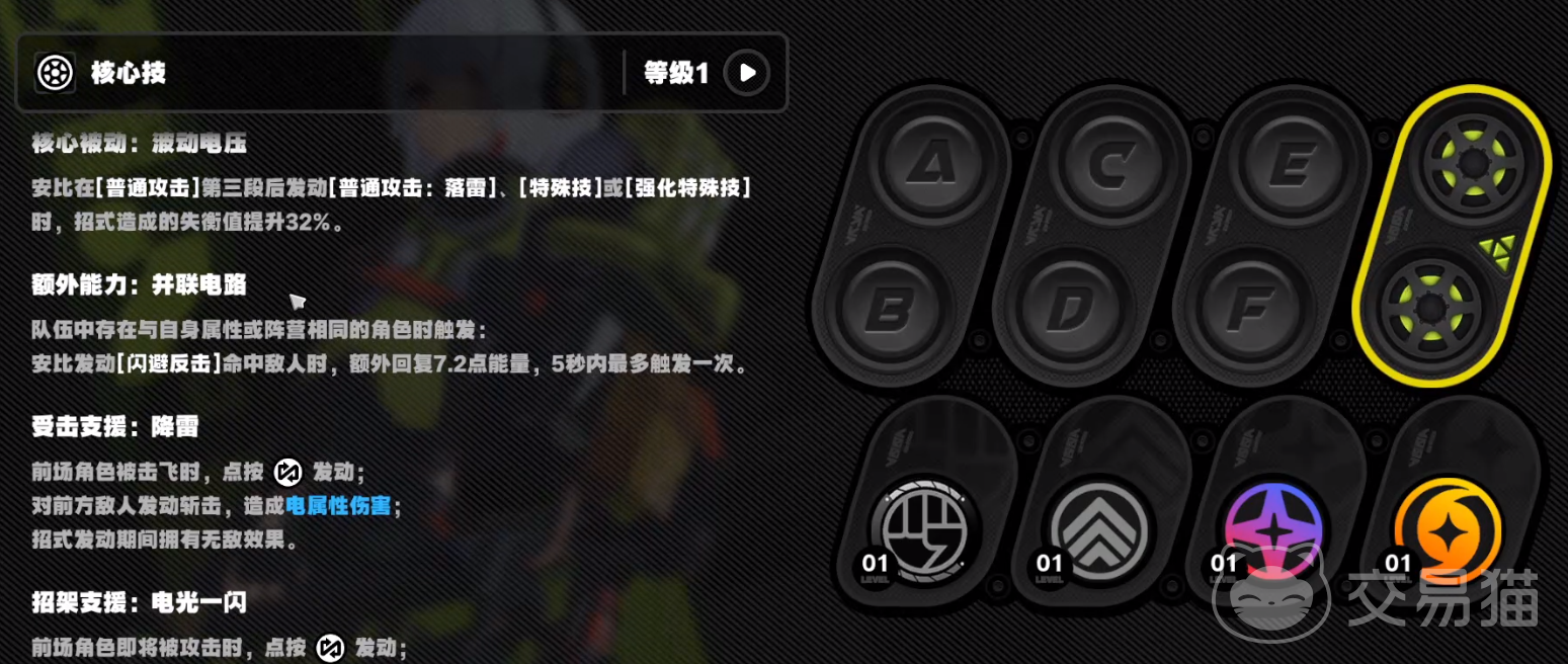 该角色的技能主要是雷电附魔的短刀攻击,对敌人造成不可逆的伤害的同时还具有雷霆一击的的效果,雷霆一闪增加伤害打出华丽的攻击的同时快速切换队友离场打出高循环的伤害的同时,还能规避掉许多伤害,是游戏里面的常见操作之一。