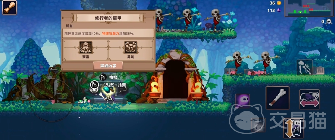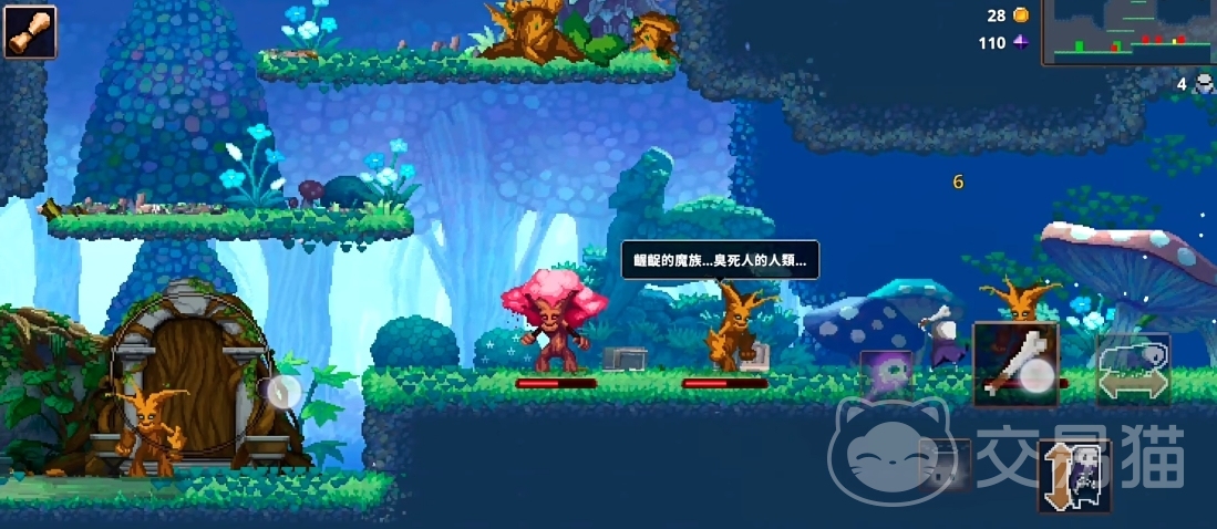 游戏在画风上采用了像素风格,不过每个小怪,建筑和场景都设置的非常精细,在与小怪战斗的时候还能从它们口中看到生动传神,能彰显角色性格的话语,同时每一个关卡击败敌人后都能获取对应的战利品,给予了玩家满满的收获感。