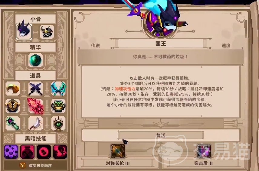国王:它是由联动死亡细胞的头骨囚犯进化而来的一个超强速度型头骨,攻击敌人可以获取细胞,集齐五个细胞还可获得随机的能力增益,包括物攻,减cd和减伤,此外,它还能再任意地图都发现武器,相比其他头骨获取装备会更快,一技能的长枪和二技能的盾则分别能提供穿刺伤害和位移反击。