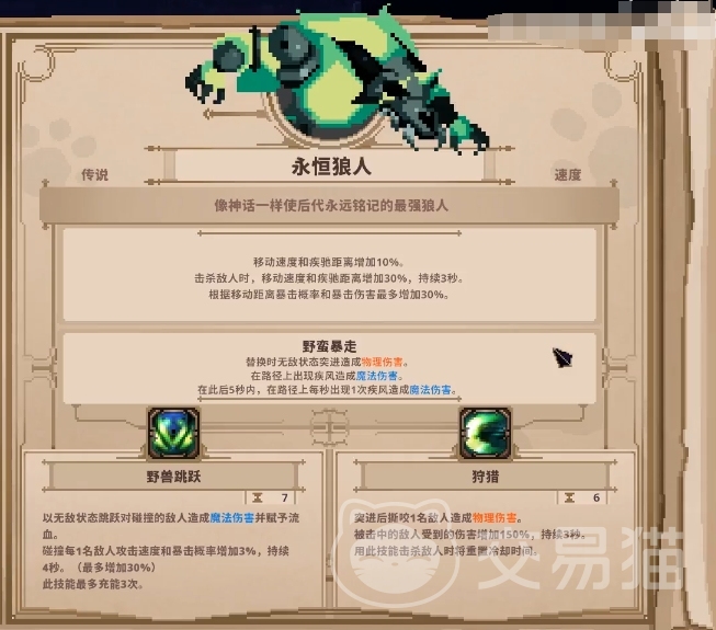 永恒狼人:顶尖的速度型头骨,移速和冲刺距离都通过特性得到加强,这给它带来了卓越的跑图能力,并且高速的跑图带来的更多移动距离还能为它提供最多30%的暴击几率和暴击伤害加成常青树,一技能还能以无敌状态跳跃并伤害敌人,同时还能挂流血,二技能则是突进撕咬敌人,并且还会另敌人接下来三秒内所受伤害增加,这一技能若击杀敌人更是能直接刷新CD。