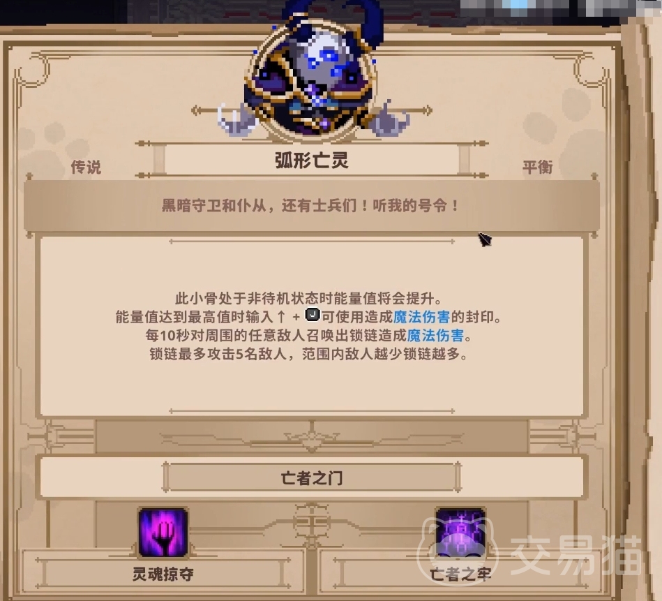 弧形亡灵:强度超高,且饱受老手玩家好评的一款无脑速通头骨,它的特性让其只要处于非待机状态即可提升能量,能量值最高时打破封印将会间歇性的召唤锁链对周围敌人造成魔法伤害,并且这些锁链最多能打五名敌人,若敌人数量变少则打在单一敌人身上的锁链还会增加,基本上它不用技能都可以重创对手。