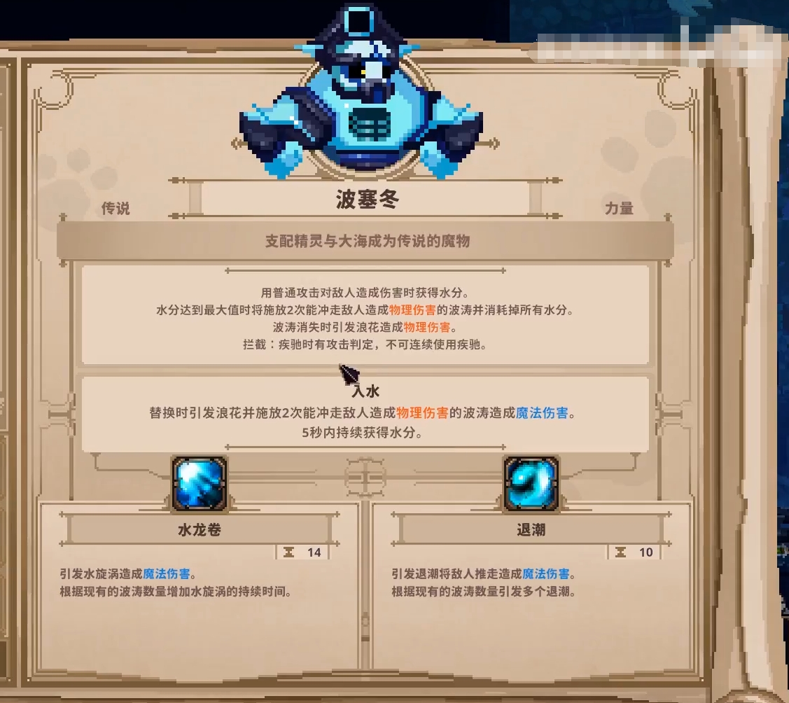 波塞冬:由水小骨进化而来的传说力量骨,特性令它通过普攻积攒水分,水分足够后则会消耗它来召唤波涛,以此对敌人造成伤害和击退,替换上场时也能引发浪花冲走敌人并造成混合伤害,一技能和二技能则都是魔法伤害,分别会引发水旋涡和退潮,技能伤害很高,但冷却时间也同样很长。