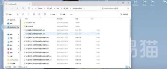 然后,我们来看看第二种方法,这个方法稍微复杂一些,但也能让玩家体验到更多的乐趣。首先玩家需要找到安装的游戏文件夹点击。然后继续找,找到“bin—vk_mb—newfacedata”这个路径。注意如果玩家的游戏数据是写实的,那么文件会放在带有“new”的文件夹里。如果是写意的,那就直接放在“newfacedata”这个文件夹里。