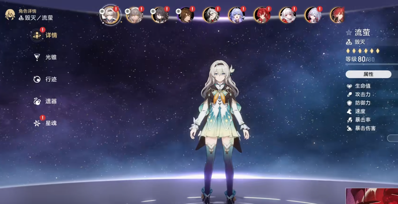 除此之外,流萤还具备对敌方挂火弱点的能力,即使在面对没有弱点的敌人时,她也能凭借出色的削韧能力无视弱点进行战斗,完全不会影响她的正常发挥。这使得流萤在多种战斗环境中都能展现出强大的实力。那么在队伍的搭配上,大家可以选择使用目前版本比较强势的破甲队伍,主要由流萤,阮梅,开拓者,搭配上【拉赫】来进行组成,阮梅可以给队伍提供高倍率击破、增伤、穿透、提速等增益,使流萤的输出能力得到极大的提升。开拓者则拥有全队击破和伤害提升的效果,进一步增加队伍的输出能力。加拉赫作为辅助角色,提供治疗和易伤效果,保证队伍的生存能力。这套阵容在击破敌人方面表现出色,能够快速将敌人击入击破状态,从而后续可以打出更多的伤害。