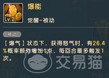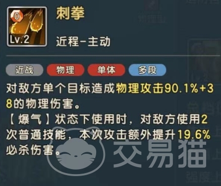 他的第二个技能为刺拳,这是一个主动型技能,可以对敌方单体目标造成物理攻击90.1%+38的物理伤害,在暴气状态下对敌方使用两次普攻技能可以额外获提升19.6%的必杀伤害。另外,他还拥有两个被动技能,第一个为快速热身,在造成伤害的时候有25.8%的概率会获得一点怒气值,每回合最多触发两次。第二个被动技能为爆能,这是一个觉醒技能,在爆气状态下时获得怒气值有26.4%的概率额外增加一点,每回合最多可触发一次,这两个技能都是可以帮助无数仙人掌来叠加怒气值的。