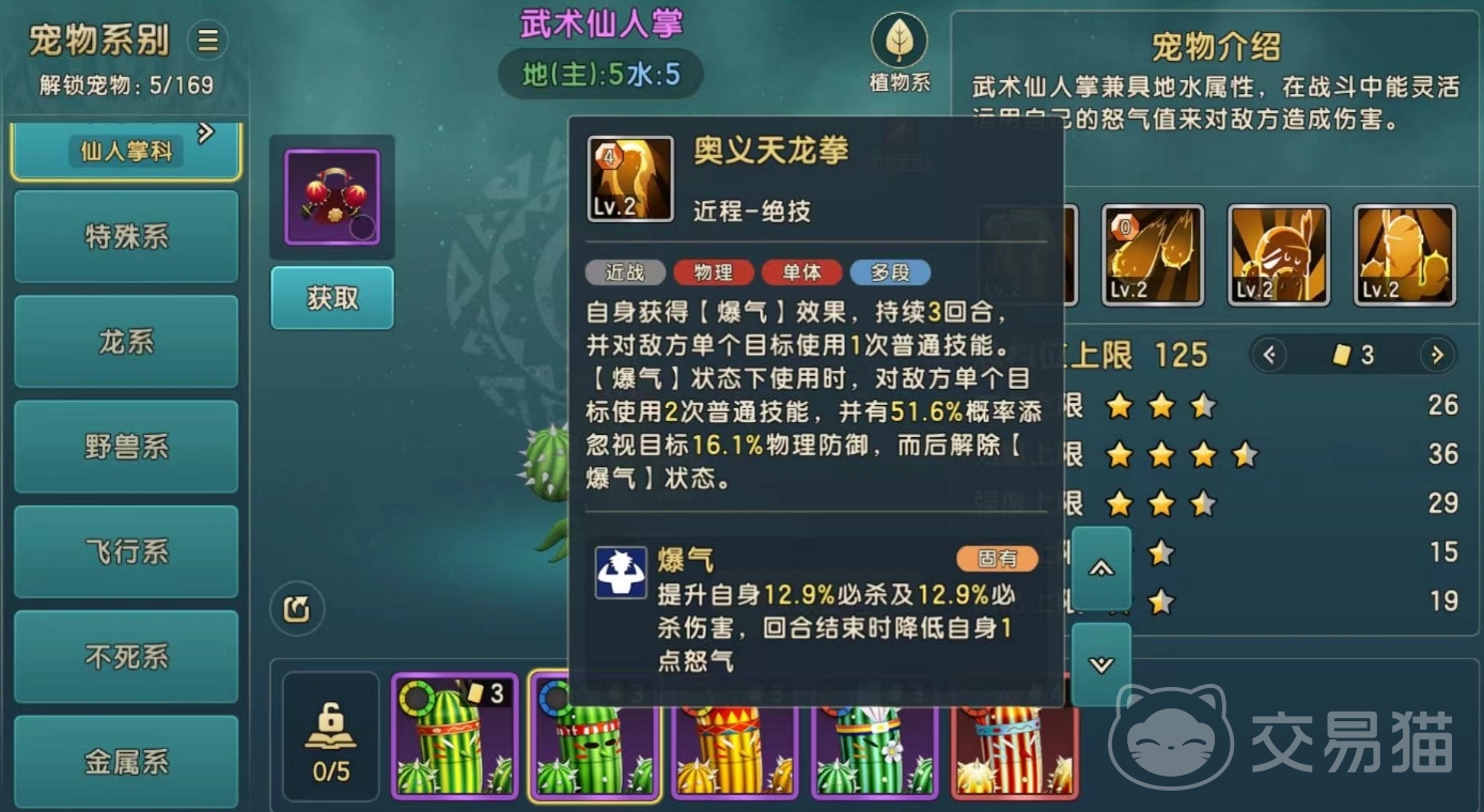 武术仙人掌是一个紫色品质的宠物,在游戏内稀有程度还不错,它可以运用自身的怒气值来给敌方造成强势伤害,灵活性较高,总档位125,以力量为主,属于地水属性的宠物,玩家可通过野外捕捉以及宠物交易市场获取,这个宠物目前一共有四个技能,第一个技能为奥义天龙拳,这是一个近战物理攻击技能,可以利用自身的暴击效果对敌方单体目标造成一次普攻技能,在暴气状态下可以对敌方单体目标使用2次攻击,并且造成120%的攻击效果,还有51.6%的概率可以忽视目标16.1%的物理防御。