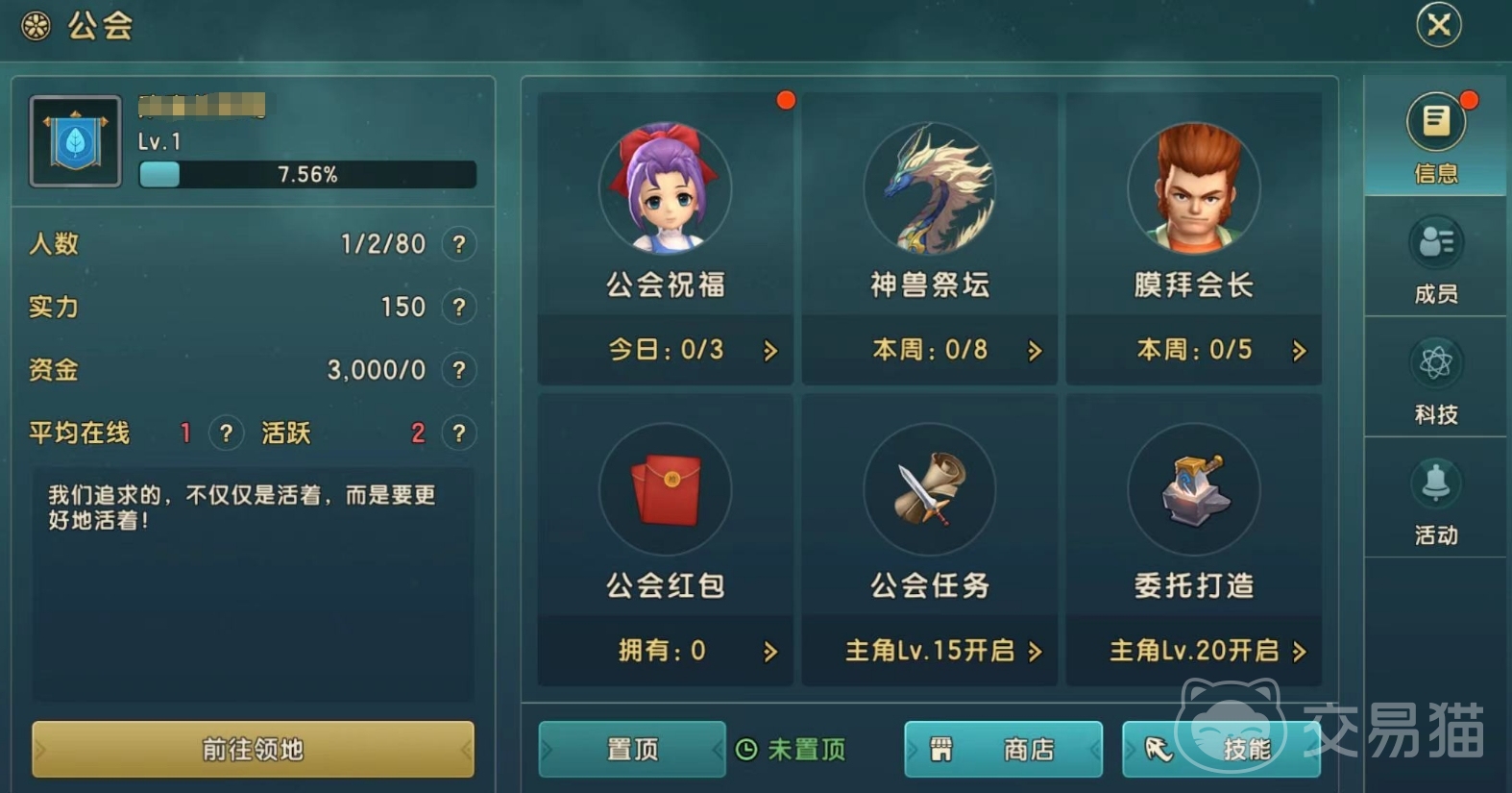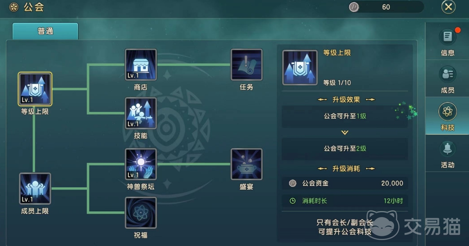 除了这个常规的玩法之外,还有一种玩法为科技玩法,科技玩法只有会长可以操作,可用于提升公会的科技上限,能够使商店技能、任务、盛宴等多种形式的等级提升的更高。