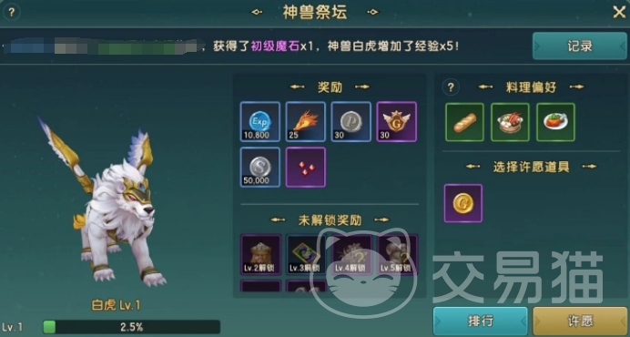 第二种玩法为神兽祭坛,神兽祭坛是一种许愿玩法。我们可以在这里面找到自己公会的神兽,通过给其投喂料理的形式来获取一定的奖励,每周最多可以许愿8次,获取的奖励会根据料理的偏好来随机生成,包括经验、公会贡献以及魔石等等。而且公会的神兽也会随着大家许愿的次数增加而不断叠加等级,等级越高,所能给大家带来的奖励就会越丰盛。