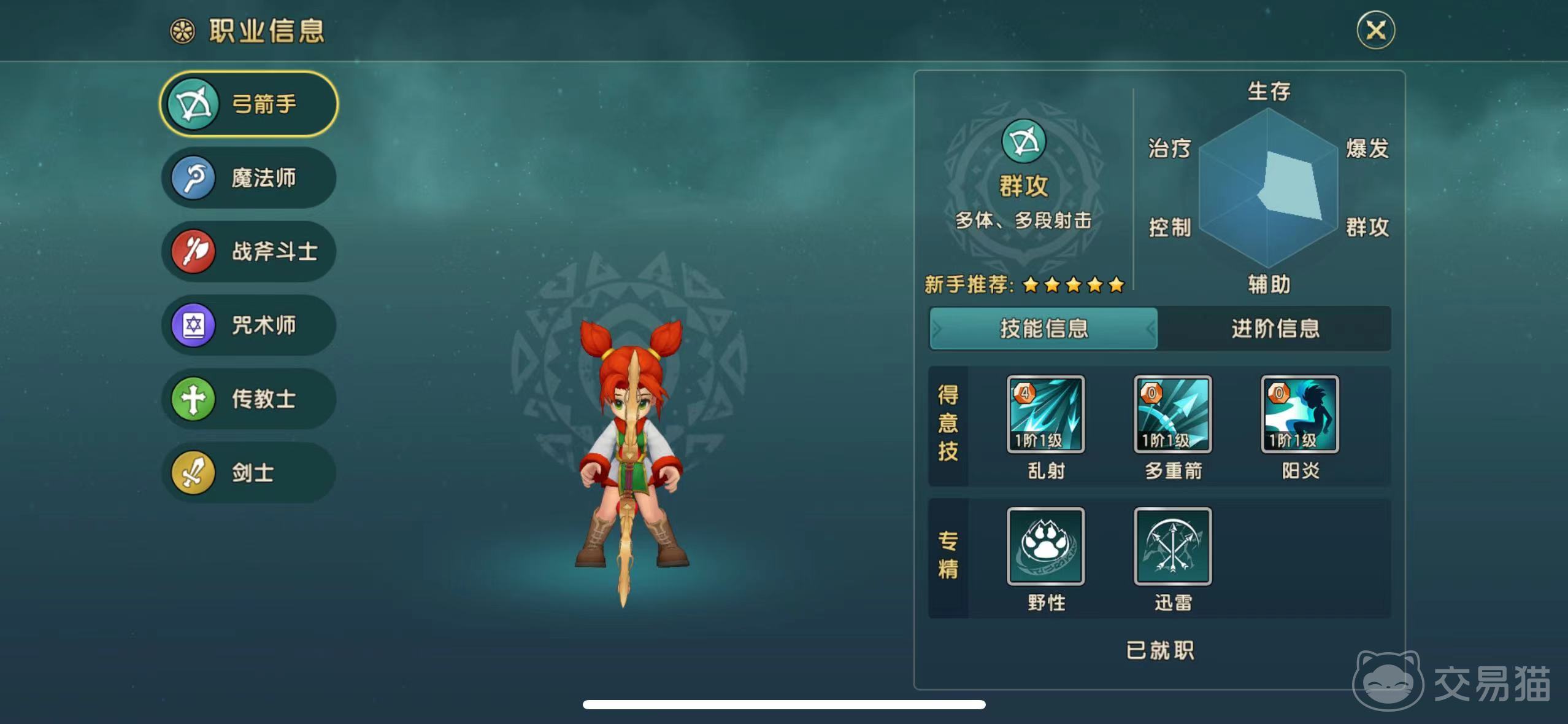 第二个职业为弓箭手,弓箭手在游戏内是最适合普通玩家的职业了,他拥有两个核心技能,可以用于远程攻击,也可用于近战,不过由于他的技能数量较少,这也就意味着在团战中他的灵活性较差,同样是需要以队友保护的C位英雄,不过他的输出高,也是很多玩家比较喜爱的。