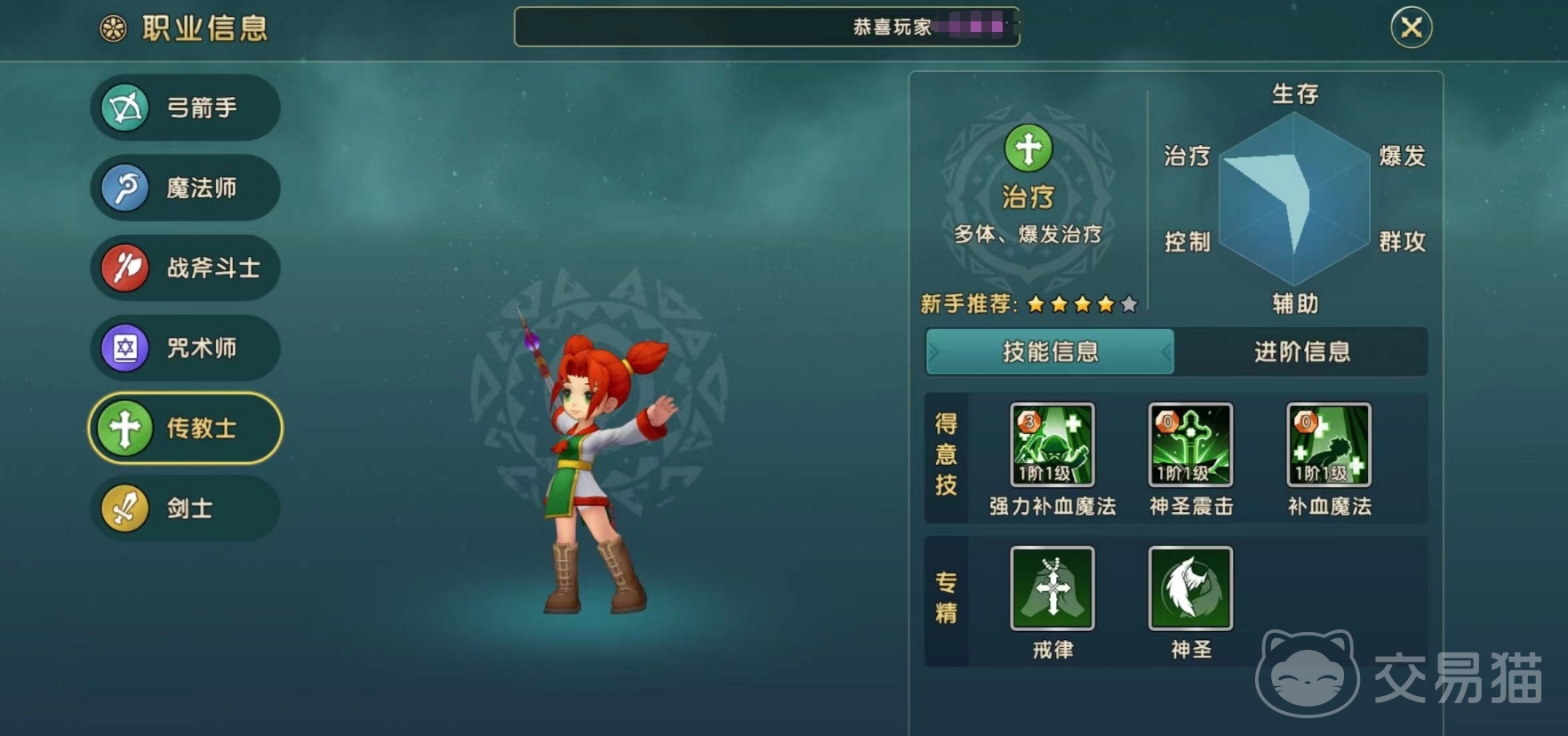 第五个职业为传教士,这是一个辅助型的角色,拥有强大的治愈能力,无论是站在前排后排都是可以的。在团队作战中,它可以帮助队伍快速的恢复能量,有效的保证我方输出队友的存活,让战斗变得更加简单。