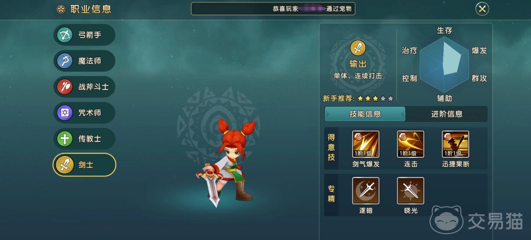 第六个职业是剑士,这个职业属于一个近战物理战士,拥有连续打击的能力,生存能力较强,可以站在前排抵挡敌方的攻击,同时也可以用于输出角色进行战斗。无论是在任何副本中,他都能带来比较不错的收益,尤其是在面对脆皮角色的时候,他更是可以不断的消耗对手,站在前排和后排都是可以的,能够产生比较不错的输出效果,是一个全面发展的职业。