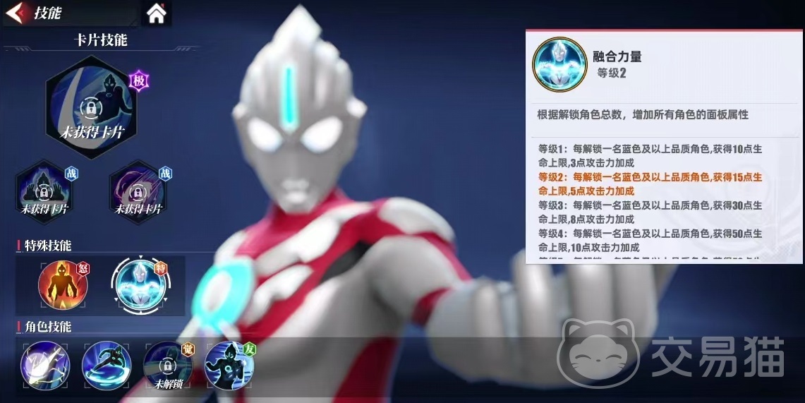 第2个激战技能欧布原生光轮,释放出巨大的光轮原地旋转,所有靠近目标都将受到持续伤害,在对方近身之后可以直接使用。他还有一个比较特殊的技能融合力量,能根据解锁角色总数,增加所有角色面板属性。解锁的数量和品质越高,获得的生命及攻击力加成也就越高,当然这属于锦上添花的类型。