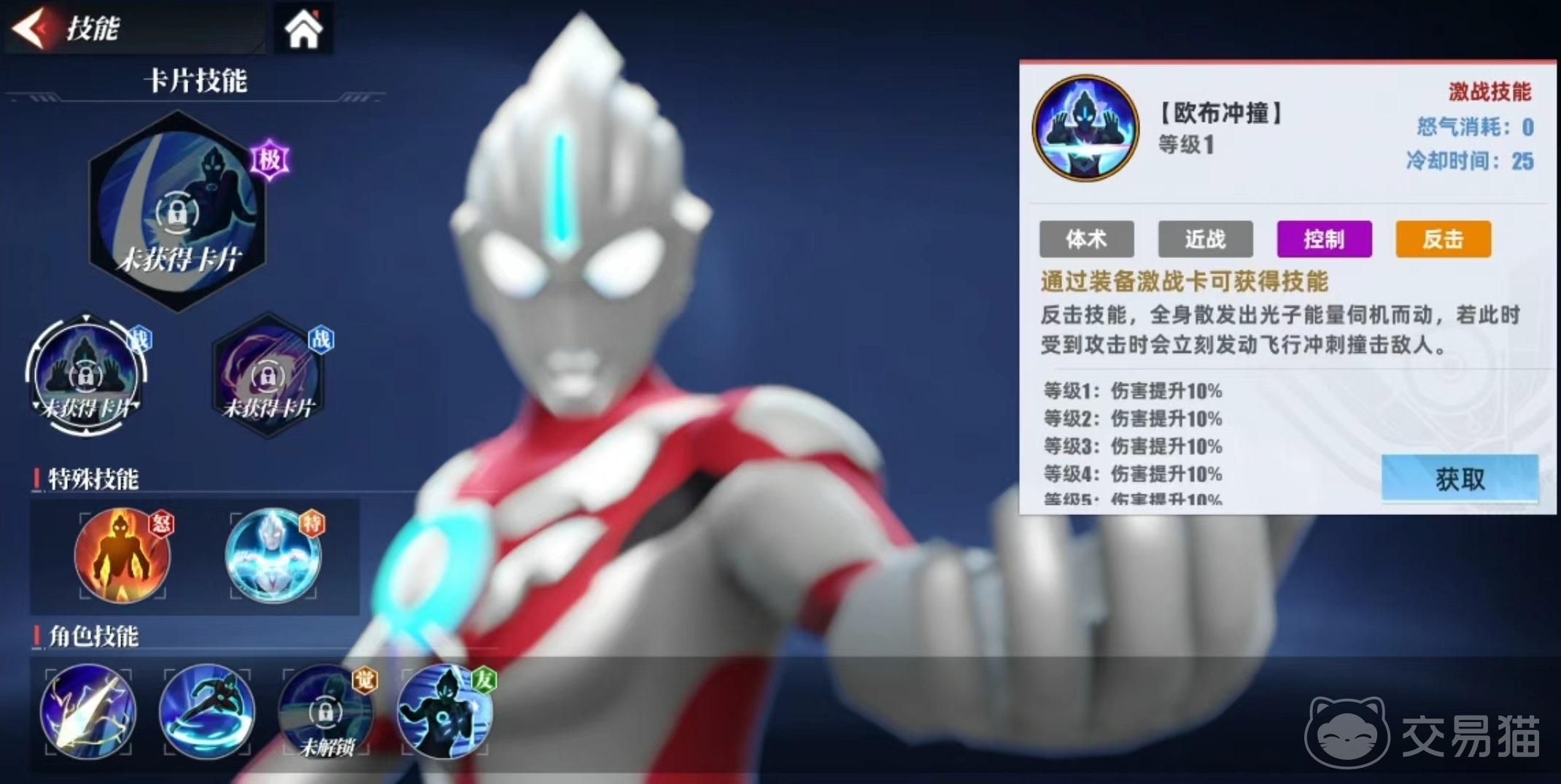 作为紫色品质角色,自然也有自己通过卡片获取的强大技能,首先是终极技能欧布切割攻击。发射出半月状的大型欧布飞镖后,利用飞踢将光刃高速前进攻击敌人。技能要消耗200点怒气,有45秒钟冷却时间,威力极大,往往是很多连招的最后终结手段。接下来是激战技能欧布冲撞,是一个可以反击的技能,全身散发出光子能量伺机而动,如果此时受到攻击,可以直接发动飞行冲刺敌人,比较考验使用的技巧,尤其是要预判好对方的动作。
