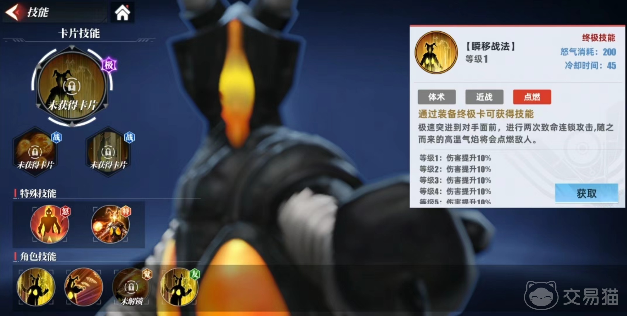 在格斗方面可以利用自身的终极技能瞬移战法来创造优势,快速推进到对手面前,进行两次致命连锁攻击,随之而来的高温还会将敌人直接点燃。这样的技能既有位移又有强势的攻击,是非常有威胁的。第1个激战技能连续火球,发射出多枚高温火球烧焦敌人。第2个激战技能芝顿屏障,升起远程反馈屏障,能阻挡远程子弹的攻击,并瞬移反击攻击者。
