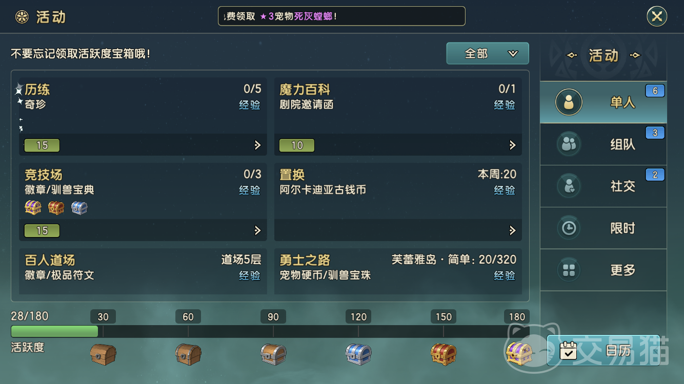 在宠物阵型上可以选择灰螳螂+水蓝鼠+吓人箱+丘比特+辅助系的宠物,这样的阵型既能有大量的伤害又能兼顾治疗,确保队伍的续航能力。在20级的时候驯兽功能开启了,在30级的时候也要利用驯兽来提升整体科属宠物的技能和各项属性。