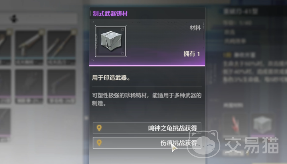 不过锻造武器也是需要一些材料的,比如紫晶簇、红针晶簇和制式武器铸材,其中制式武器铸材是锻造武器的必需品,可以通过鸣钟之龟挑战和伤痕挑战获得,不过通过这两次挑战获取制式武器铸材的次数是有限制的,每周只能获得三次。