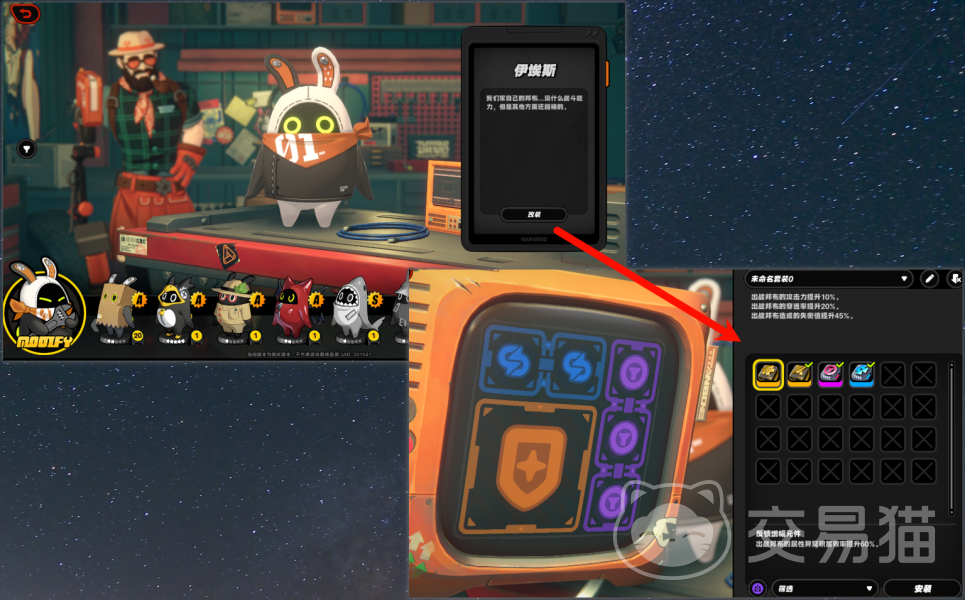 养成也是被区分为两个大块的,首先是自带的伊埃斯的基础属性,其次就是抽到的邦布的等级还有技能方面的培养。先看伊埃斯,可以从涡轮改装店里看到,左下角就是伊埃斯,点击改装之后,就可以通过不同芯片的配置来将邦布的基础属性提升,这些改装芯片都是从零号空洞中获取的,零号空洞会掉落材料,可以兑换成邦布培养的芯片,芯片也有等级的分类,S级最高,然后AB级,对于邦布属性的加成,有攻击力,暴击率,暴击伤害,以及防御力这些,评级对于属性数值是有影响的。