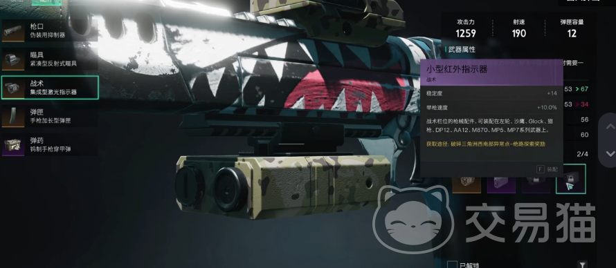 那么,这种配件到底有什么用呢?小型红外指示器,听名字就知道,它能发出红外线,帮助玩家在射击时更准确地锁定目标。特别是在夜晚或者光线不好的地方,这个配件简直就是神器,让玩家的射击精度大大提高。这是个很实用的东西。它能在玩家的武器上加上一个小红点,这个红点就是玩家射击的准心。这样一来无论玩家怎么移动,只要红点对准了目标,那一枪打出去,基本上就能命中。