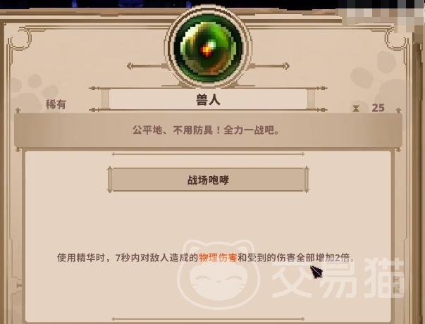 兽人:冷却效果二十五秒,使用后虽不会召唤帮手,但却能让自身造成和物理伤害和所受的物理伤害都翻倍。