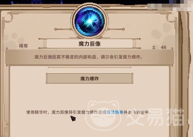 魔力巨像:长达46秒冷却的一个稀有精华,使用后会召唤魔力巨像引发爆炸,以此造成巨额伤害并击飞周围所有敌人,它虽然冷却极长,但爆发伤害和控场却在稀有精华中首屈一指。