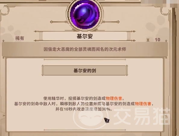 基尔安:这个精华的冷却时间只有十秒,使用后会投掷基尔安的剑造成物理伤害,并且敌人时你的小骨会瞬移到剑所在的位置并挥动它造成二段伤害,同时还会再接下来十秒内提升30%攻速。