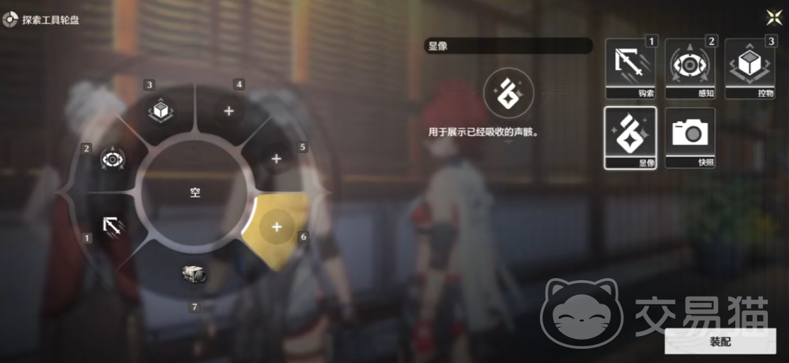 点开探索工具之后就可以看到我们的探索工具轮盘了,这里有快照、控物、钩索、感知和我们本期要讲的显像功能,点击显像图标将它在左边的探索工具轮盘上进行装配就成功安装上了。