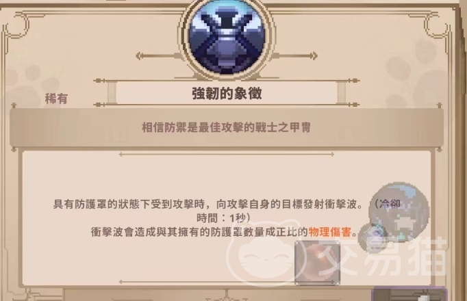 强韧的象徽:稀有级别的装备,一般只会在关卡最后的宝箱开出,效果是在具有防护罩的情况下受到攻击时会向攻击者发射冲击波,这个效果冷却时间只有一秒,并且防护罩数量越多,冲击波的伤害就越高。