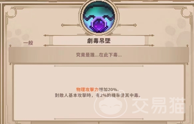 剧毒吊坠:它是一件一般装备,往往在前期的避难所商人处就能晒出,效果是增加20%物攻,并在普攻敌人时有2%几率令其中毒。