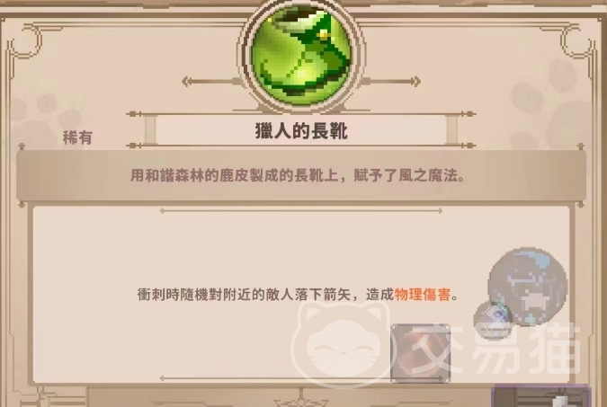 猎人的长靴:也是一件稀有装备,可以在关卡中获得,也可以在魔王城npc处刷出来,效果是冲刺时对附近敌人落下附带物理伤害的箭矢,配合狼人这种靠冲刺输出的头骨非常好用。
